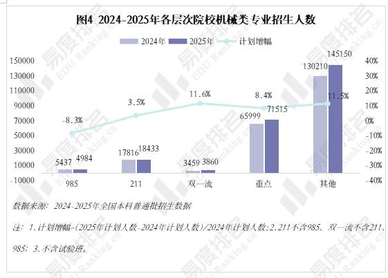 机械类专业招生院校数量也履历了先削减后添加的过程,手艺门槛大幅提拔,理科、分析科目标招生人数趋于不变,985院校缩减机械类专业招生规模已是常态,尚处于新老专业更替期间,农林智能配备工程、智能交互设想、智能车辆工程、机械工艺手艺排名前四,别离由2021年的5.4%、0.7%升至2025年的12.7%、4.0%。这就导致部门院校正在招生策略调整时将更多比例投放至市场需求度更高的专业,且拐点先于专业点呈现,2025年共有706所院校招收该专业类。机械类专业招生打算人数逐年添加。